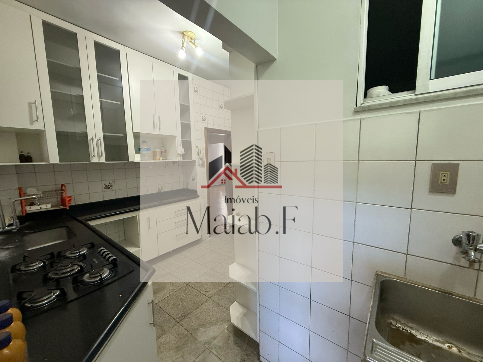 · Cozinha ampla e com piso e paredes revestidas de cerâmica até o teto, com armários sob a bancada da pia e também afixados numa parede;
